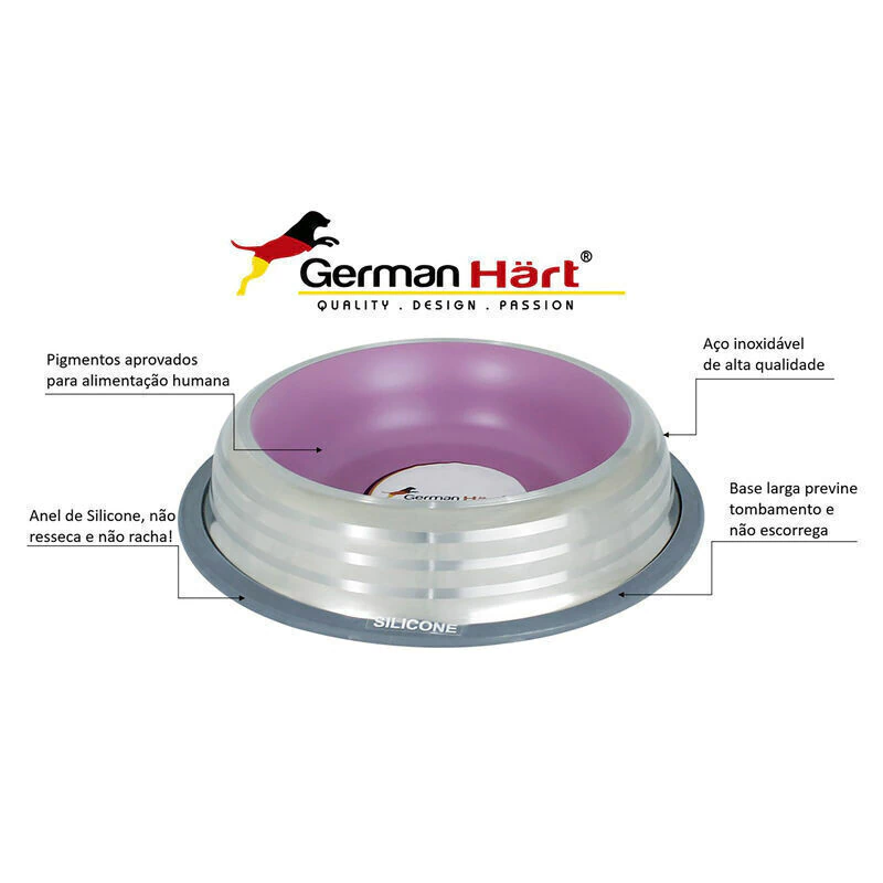 Os Comedouros Premium GermanHart unem design sofisticado com altíssima durabilidade. Coloridos por dentro e com acabamento prateado por fora, são ideais para tutores exigentes que buscam qualidade e estilo.