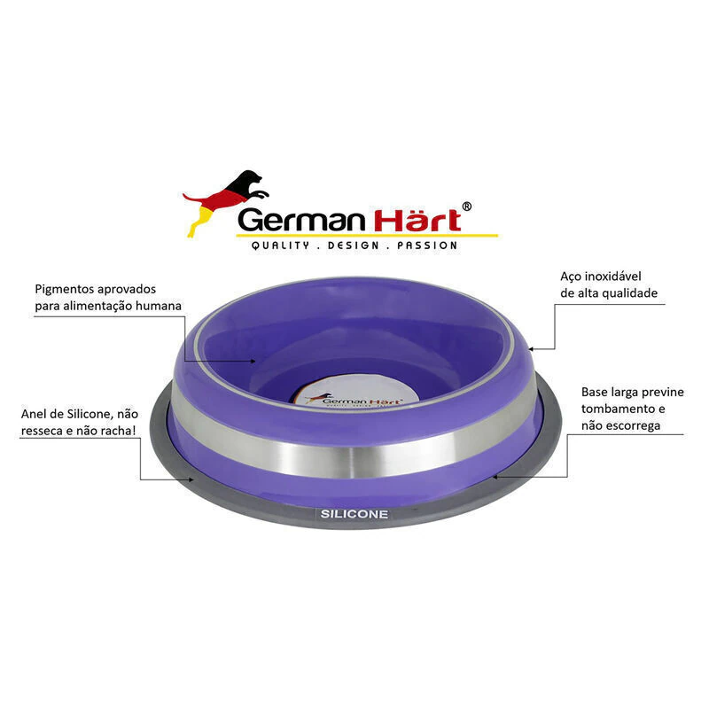 O Comedouro Inox Prestige GermanHart Roxo é ideal para quem busca resistência, segurança e um visual moderno na hora da refeição. Fabricado em aço inoxidável de alta qualidade, possui base antiderrapante com anel de silicone que evita tombamentos e escorregões — sem ressecar ou rachar.